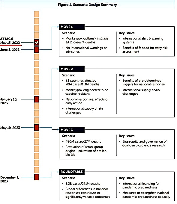 “Developed in consultation with technical and policy experts, the exercise scenario portrayed a deadly, global pandemic involving an unusual strain of monkeypox virus that first emerges in the fictional country of Brinia and eventually spreads globally,” the document states. “Later in the exercise, the scenario reveals that the initial outbreak was caused by a terrorist attack using a pathogen engineered in a laboratory with inadequate biosafety and biosecurity provisions and weak oversight. The exercise scenario concludes with more than three billion cases and 270 million fatalities globally.”
