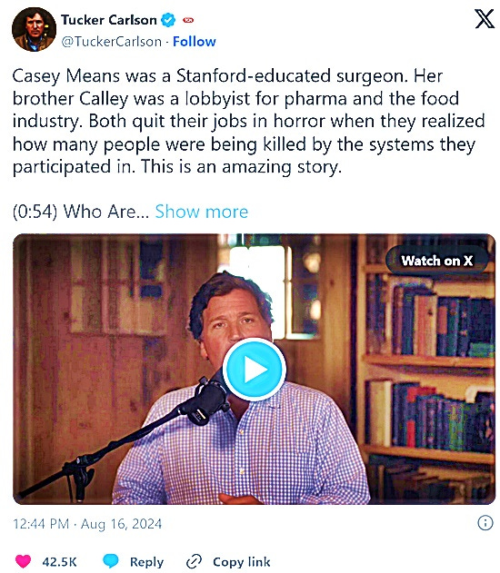 X/Twitter VIDEO: Tucker Carlson - Casey Means (Stanford-educated surgeon & Her Brother Calley (Pharma Lobbyist & Food Industry) - Both Quit Their Jobs
